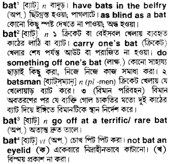 Thanks for using this online dictionary, we have been helping millions of people improve their use of the bangla language with its free online services. Bangla meaning of bat is as below...