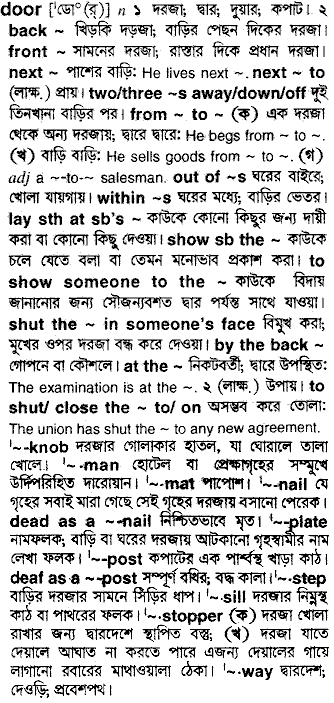 Thanks for using this online dictionary, we have been helping millions of people improve their use of the bangla language with its free online services. Bangla meaning of door is as below...